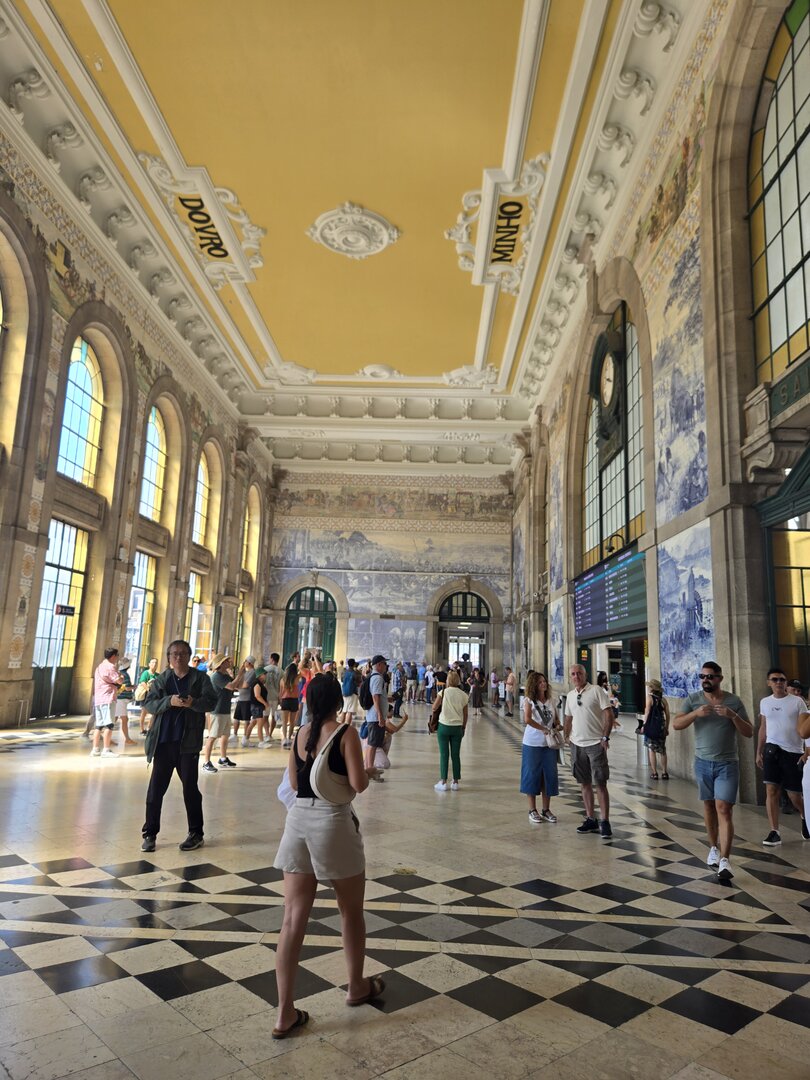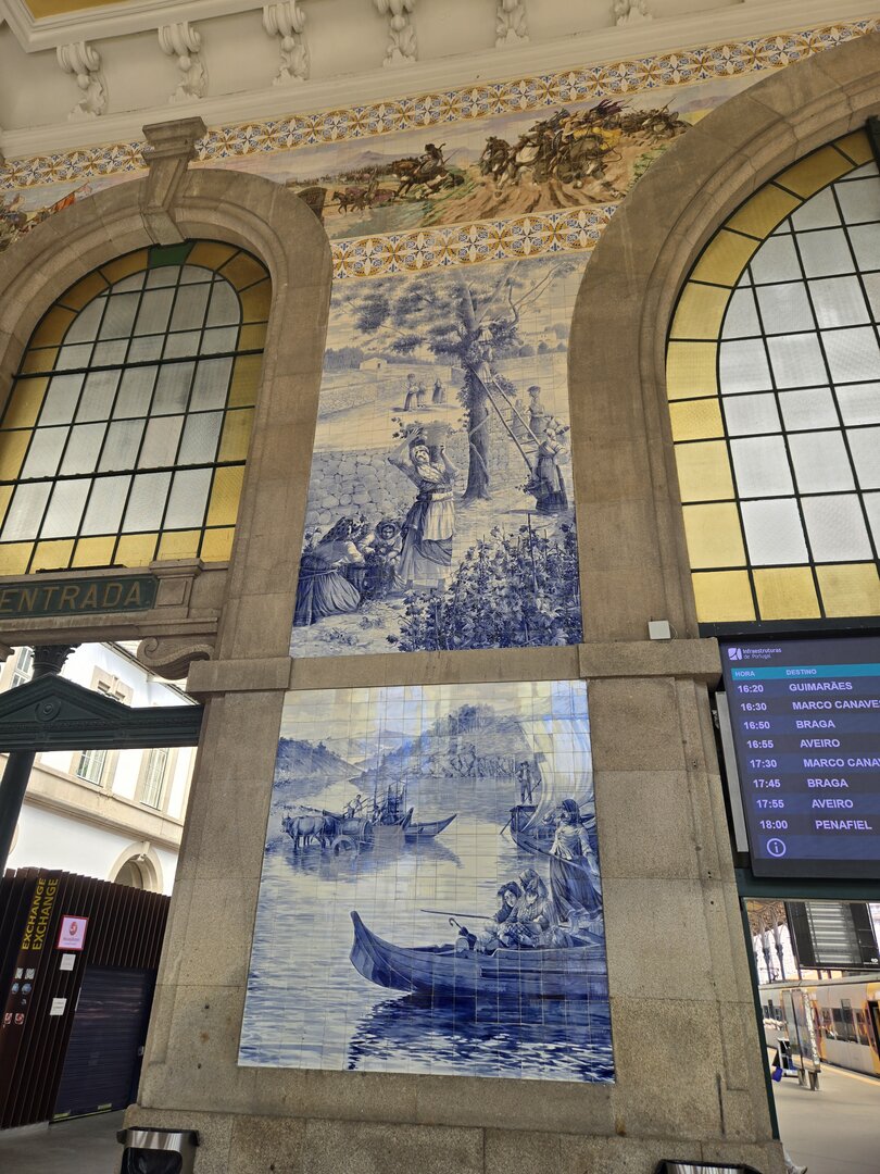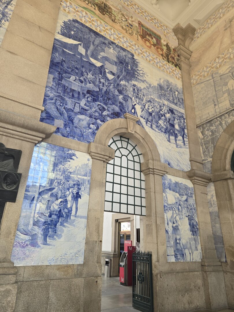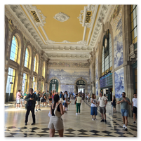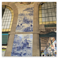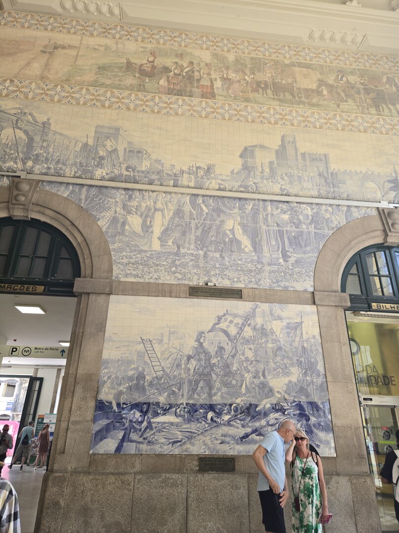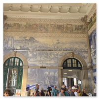 Heading back to Porto today for a walking tour that included a cathedral, the stock exchange and the Porto train station, famed for the beautiful hand-painted azulejos tiles. Looking at the pictures, note that the tiles on several walls have what appears to be a "gauze" over them. This was done to protect the tiles from damage/cracking during construction at the station.